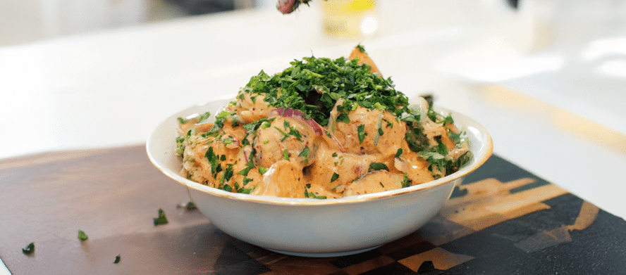 Retire as batatas assadas, corte-as em pedaços e coloque em um recipiente. Misture a maionese preparada com as batatas. Adicione a cebola roxa picadinha e finalize com salsinha e pimenta por cima.