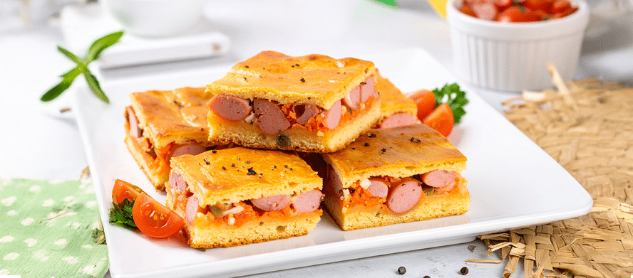 Despeje metade da massa na forma, espalhe o recheio de salsicha e cubra com o restante da massa.